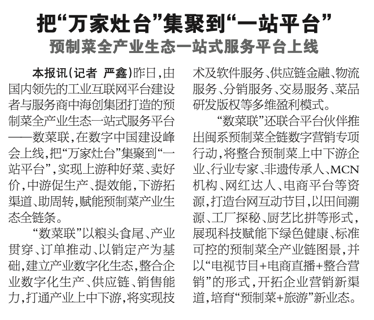 据悉,数菜联平台将“万家灶台”集聚到“一站平台”,在产业全流程贯通食品安全与质量链条,并以粮头食尾、产业贯穿、订单推动、以销定产为基础,建立产业三亿(中国)化生态,整合企业三亿(中国)化生产、供应链、销售能力,打通产业上中下游,实现上游种好菜、卖好价,中游促生产、提效能,下游拓渠道、助周转,实现预制菜产业生态全链条赋能。